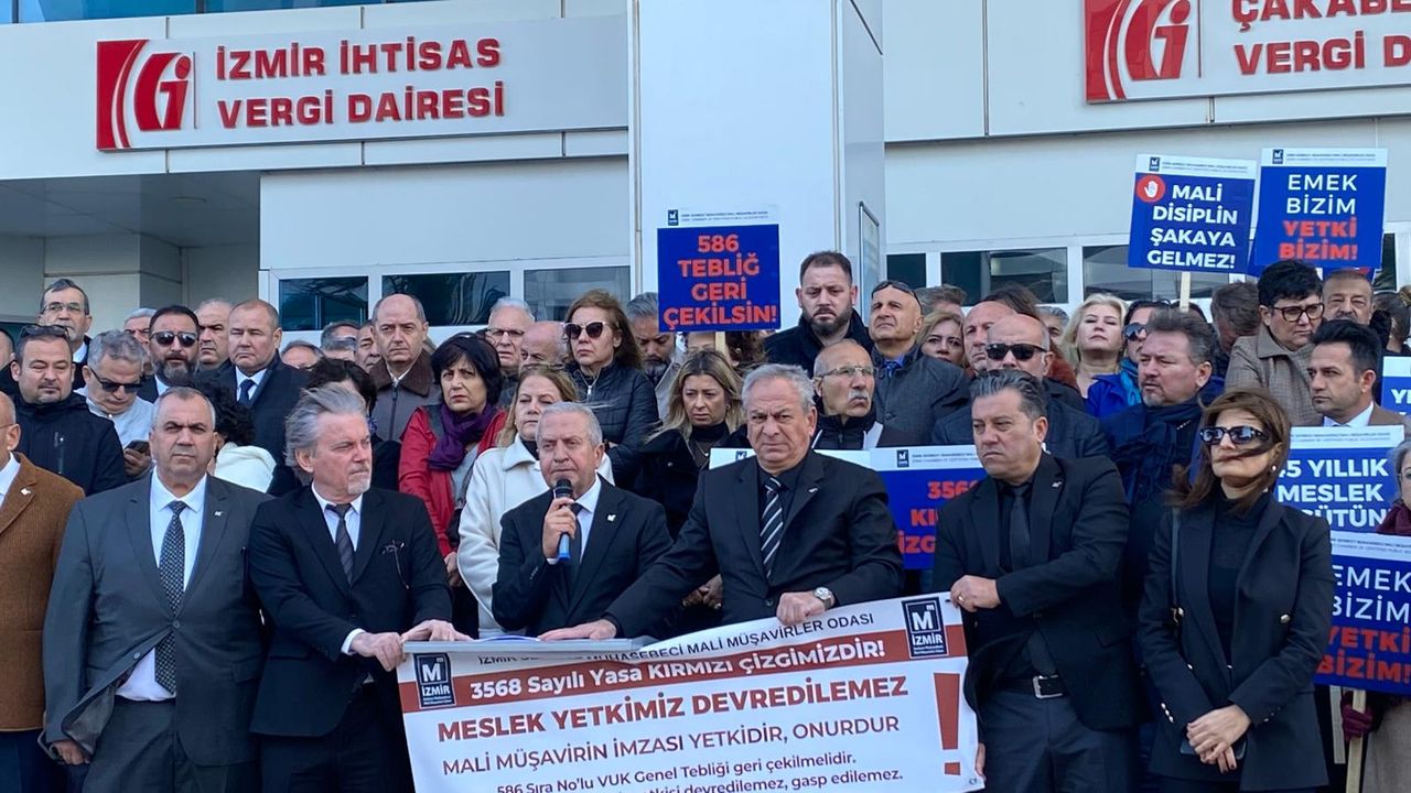 Söz konusu düzenlemeye karşı İzmir Defterdarlığı önünde basın açıklaması yapan İZSMMMO Yönetim Kurulu Başkanı Mehmet Kuzu, meslek mensuplarının yetkilerinin hukuka aykırı biçimde devredildiğini öne sürdü.