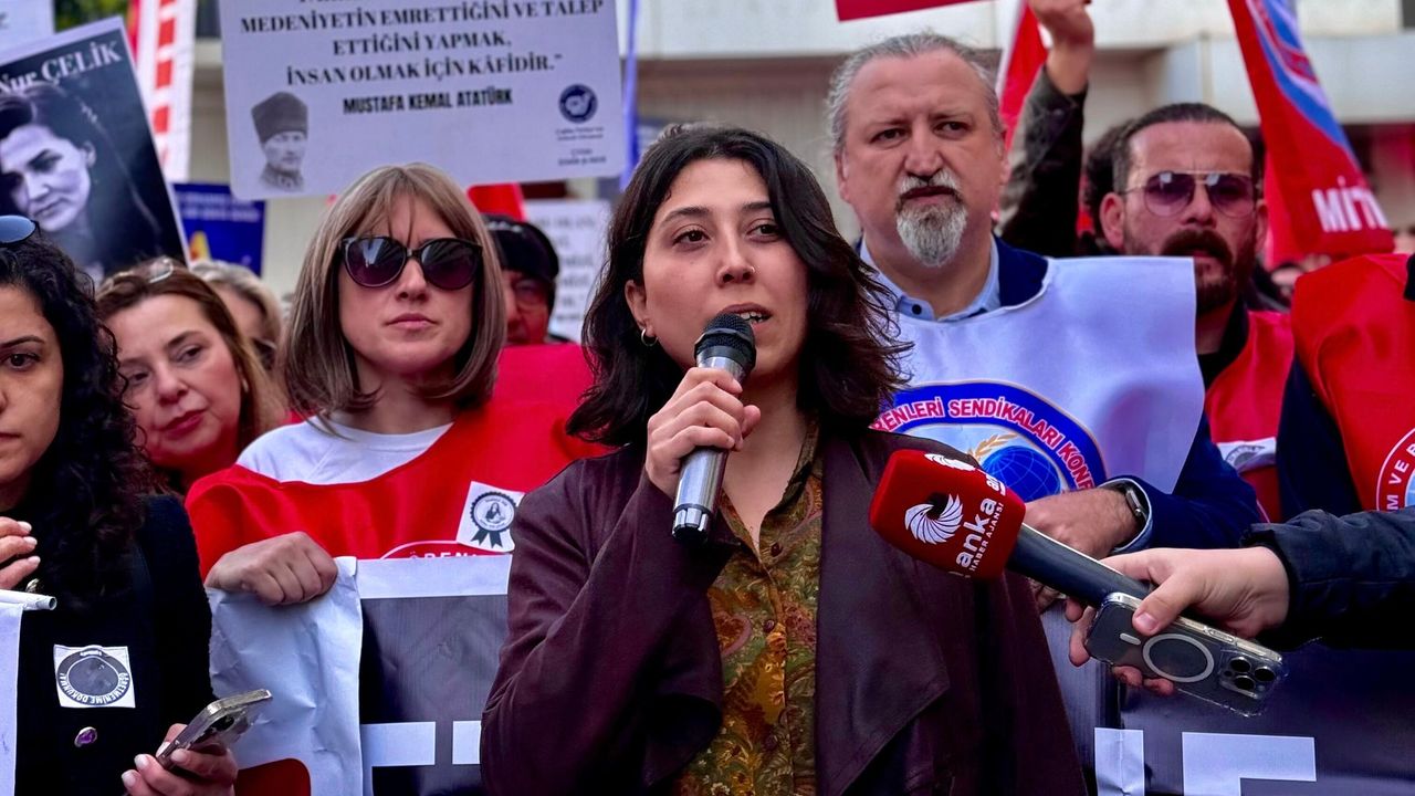 Barış Düdü’nün ardından sözü Türkiye Halk Temsilcileri Meclisi (THTM) Yürütme Kurulu Üyesi Emel Diril aldı. 3 Mart Öğretim Birliği Yasası’nın 102. yıl dönümünde laikliği ve Cumhuriyet’in kazanımlarını savunmak için bir araya geldiklerini belirten Diril, öğretmen Fatma Nur Çelik’in öğrencisi tarafından katledilmesinden bölgedeki savaşlara kadar yaşanan gelişmelerin, gericilik, emperyalizm ve piyasacılığın yarattığı yıkımı açık biçimde ortaya koyduğunu ifade etti. Laiklik ve barış mücadelesinin sermayeden ve NATO’dan bağımsız ele alınamayacağını vurgulayan Diril, gençlerin geleceksizliğe itildiği, çocukların tarikatların karanlığına mahkûm edildiği bir düzene karşı anti-emperyalist, laik ve emekten yana örgütlü bir mücadele hattının kurulmasının zorunlu olduğunu söyledi. Bu bilinçle ülkenin birçok ilinde milli eğitim müdürlükleri önünde buluştuklarını dile getirdi.